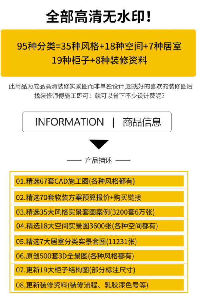 素材类型丰富:包含各种风格的CAD施工图,如现代简约、中式、欧式等,可帮助装修者了解不同风格的设计细节和施工要点。还有风格实景套图案例和3600张空间实景图,能让装修者直观看到不同装修风格和户型的实际效果,便于确定自己喜欢的装修方向。1500套3D全景图可提供沉浸式体验,让装修者更全面地感受空间布局,19大柜子结构图则对家具设计和收纳规划有很大帮助。