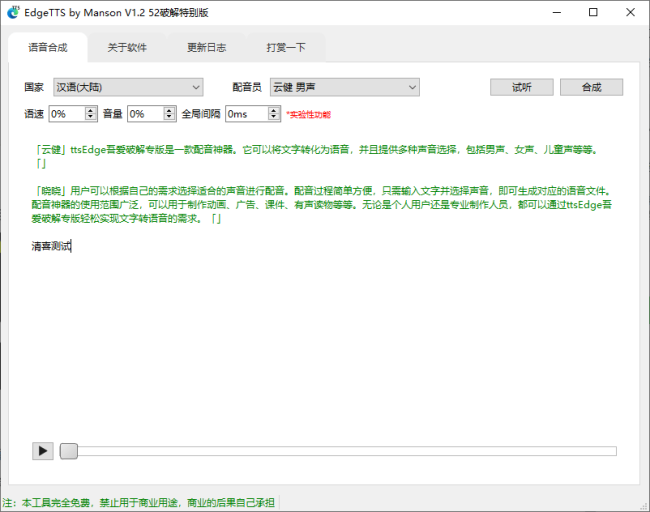 软件的特点十分突出:首先是永久免费无限制,可以放心使用;其次稳定性强,已经稳定运行一年多了;而且免安装,打开就能直接使用,非常便捷;最值得一提的是支持多角色配音,能让一段文字生成对话式的配音效果,这一功能很实用。