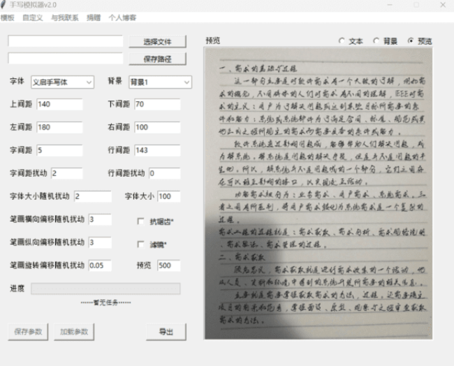 它最贴心的是多设备适配:电脑用 Windows 版,手机揣着安卓 APK,随时随地都能生成手写内容。操作起来超简单,把要抄的文字或文档导进去,选个喜欢的手写字体模板(有钢笔字、圆珠笔字等多种风格,连字迹的倾斜度、间距都能调),点击生成,几秒钟就能得到一篇 “手写体” 文档,打印出来完全能以假乱真。