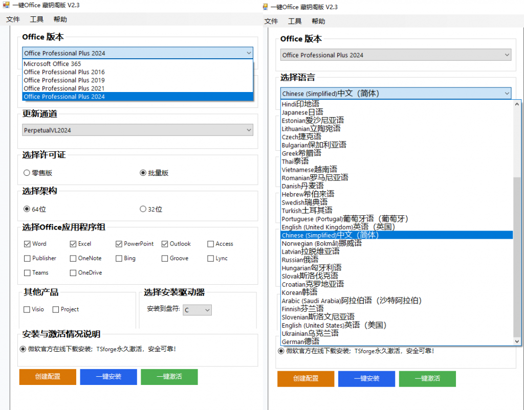 《Office一键安装与激活助手:小白也能轻松搞定》还在为安装Office发愁吗?下载慢、配置复杂、激活麻烦……现在,这些都不是问题!我们基于微软官方部署工具优化打造了一款「Office一键安装助手」,无需技术基础,不用到处找资源,更不用改代码搞配置,点几下鼠标,就能自动完成全套流程——从下载、安装到激活,全自动搞定!这款工具体积虽小,能量却大。整个软件只有509KB,绿色单文件版,无需安装,随点随用,不占空间不留痕迹,真正即开即用。【主要功能一览】- 极简操作:界面清晰、选项明了,尤其适合电脑新手。哪怕你完全不懂Office,也能一键安装、自动激活,省心省力。- 多版本支持: 可选Office 2016、2019、2021及Microsoft 365,满足不同用户偏好和兼容性需求。- 架构选择自由: 支持32位(x86)和64位(x64)系统,根据你的电脑灵活选择,不踩坑。- 自定义安装: 可自由选择语言版本、更新通道、许可证类型,打造最适合你的Office环境。- 一键激活: 内置自动激活机制,安装完成后直接享用正版权限,无需额外操作。【适合谁用?】- 电脑新手,不愿折腾系统配置和破解;- 需要快速部署Office的办公人员、学生党;- 喜欢干净简洁、不绑流氓软件的工具党;- 临时重装系统,急需恢复办公环境的用户。【使用说明】下载本工具后,直接双击打开 → 选择你想要的Office版本、语言和架构 → 点击安装 → 等待自动下载与部署 → 完成激活。全程无需值守,安心省力。——————总结来说,这就是一款真正“为你省时间”的Office部署工具。不管你是电脑小白还是办公达人,它都能让你摆脱繁琐步骤,快速、安全、免费地用上正版Office。无需犹豫,点击运行,轻松开始你的办公体验!