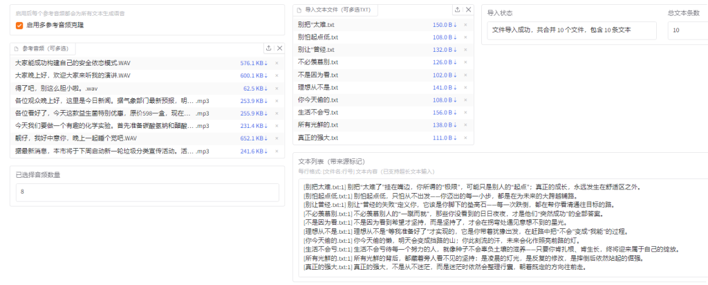# 课程介绍:TTS语音克隆与批量生成实战欢迎来到《TTS语音克隆与批量生成实战》课程!本课程专注于语音合成技术的实际应用,尤其适合有批量配音需求的内容创作者、自媒体从业者、有声书制作人员以及短视频创作者。无论你是零基础初学者,还是有一定技术背景的开发者,这门课都将帮助你快速掌握高效、高质量的语音克隆与生成技术。## 课程核心内容本课程基于先进的Index-TTS技术架构,并在此基础上扩展了批量克隆与多文本处理功能。你将学会如何通过简单的操作,实现以下功能:- **高质量语音克隆**:只需上传一段2秒以上的声音样本,即可完美复刻说话人的音色和语调- **批量生成支持**:支持一次性导入多个参考音频和多个文本内容,大幅提高工作效率- **稳定可靠运行**:经过严格测试,单次可处理长达24分钟的音频内容,约3万多字的批量生成任务## 软件特色功能**一键式操作体验**无需配置复杂环境,安装即可使用,完全免费开放给所有学员。我们的软件界面直观友好,即使没有技术背景的用户也能快速上手。**强大的批量处理能力**无论是需要生成成百上千条短视频配音,还是制作长篇有声读物,都能轻松应对。系统会自动将生成的音频文件整理到指定文件夹中,方便后续管理使用。**卓越的语音还原度**采用先进的机器学习算法,能够精准捕捉声音特征,生成的语音自然流畅,保持原说话人的音色特点和语调风格。## 学习收获完成本课程后,你将能够:- 独立完成高质量语音克隆项目- 高效处理大批量语音生成任务- 灵活应用多种声音样本进行配音创作- 显著提升音频内容生产效率## 适用人群本课程特别适合:- 短视频创作者需要大量配音- 有声书和广播剧制作人员- 教育培训机构课程内容制作- 自媒体从业者需要多平台内容输出- 任何对语音技术感兴趣的学习者加入我们,开启高效语音生成之旅!通过本课程的学习,你将掌握一项强大的内容创作技能,为你的创作之路增添新的可能。