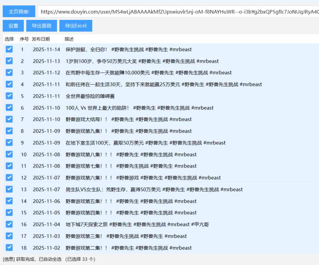《轻松搞定!抖音博主视频与数据一键批量下载教程》你是不是也经常刷到喜欢的抖音博主,想把他们所有的视频都保存下来,却又不想一个个手动下载?或者想分析一下某位博主的内容数据,却不知道从何下手?别急,今天介绍的这款工具,就能帮你彻底解决这些问题——它完全免费、操作简单,功能却非常强大!这是一款在电脑端使用的抖音视频下载工具,最大的亮点就是:不用安装、不花一分钱,就能批量下载整个博主主页的视频,并且自动整理成清晰的数据表格。无论是为了个人收藏、内容学习还是轻度数据分析,它都能帮你高效完成。| 主要功能亮点 |1. 完全免费,绿色免安装不用担心付费订阅或者突然收费,这款工具没有任何隐藏费用。下载后直接运行,不写注册表,不占系统资源,真正即开即用。2. 批量下载博主全部视频再也不用手动一个一个点击保存了。只需要输入博主的抖音主页链接,工具会自动抓取该博主发布的所有视频,一键批量下载,省时又省力。3. 高清画质,畅享1080P所有下载的视频都是1080P高清画质,观看体验非常舒服。无论是收藏还是二次剪辑,清晰度都完全够用。4. 支持导出Excel数据表除了下载视频,它还能把每个视频的数据信息——比如发布时间、播放量、点赞数、评论数量等——自动导出成Excel表格。做内容分析、竞品调研的时候特别方便。| 使用场景举例 |- 如果你是一名新媒体运营,可以用它快速收集同类账号的爆款内容,分析数据规律。- 如果你在做短视频学习,可以批量下载优质博主的视频,用于剪辑分析或模仿练习。- 哪怕只是普通用户,看到喜欢的创作者,也可以轻松备份TA的全部作品,避免视频突然消失的遗憾。| 小结一下 |这款工具真正做到了“简单却强大”,不管是普通用户还是轻度专业需求,都能用得顺手。无需复杂设置,不用额外付费,更不用头疼一个个手动下载——真正实现抖音视频下载的自动化、批量化、数据化。如果你正好需要这样的功能,不妨试试看,相信你会回来感谢我的:)